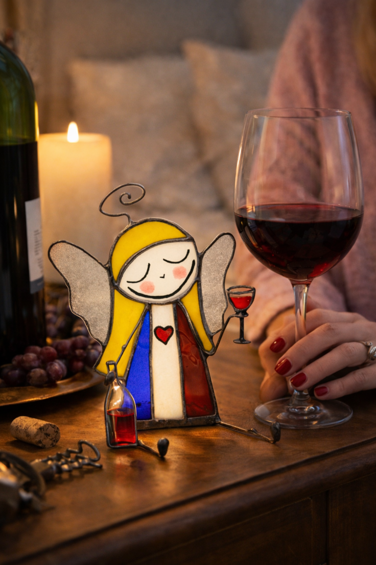Anioł z witrażu z kieliszkiem wina – na znak, że życie jest warte świętowania.