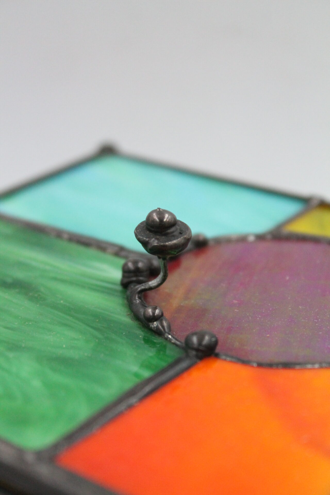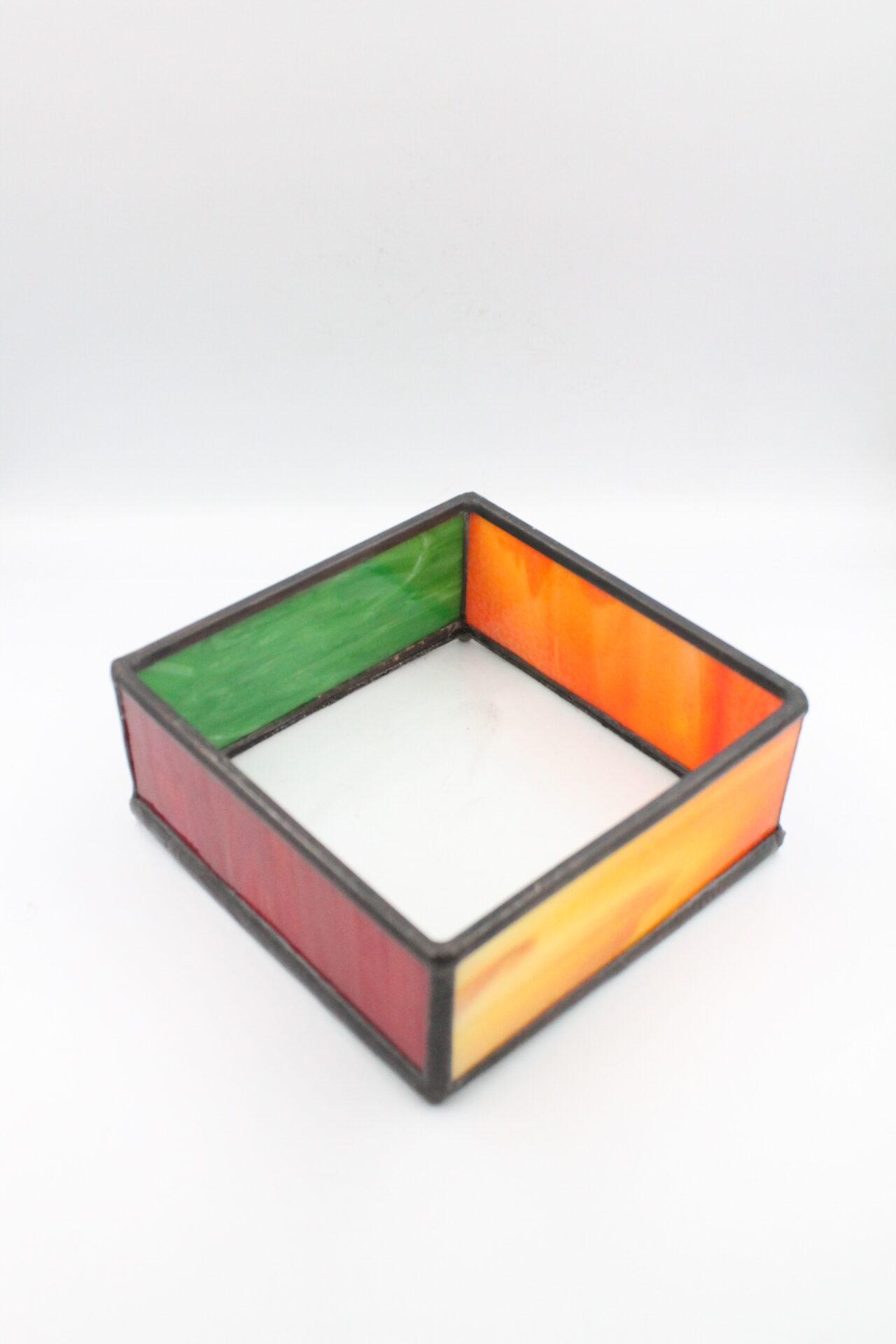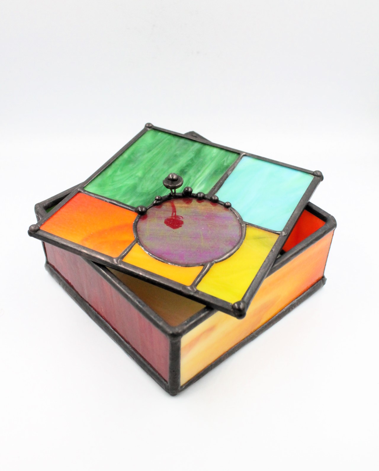 Wyjątkowe, kolorowe puzderko na biżuterię ze szkła, wykonane ręcznie w technice witrażu Tiffany. To eleganckie i praktyczne miejsce na drobiazgi, które jednocześnie stanowi dekorację wnętrza. Barwne szkło w odcieniach zieleni, żółci, pomarańczu i błękitu przyciąga wzrok i nadaje przedmiotowi niepowtarzalny charakter.