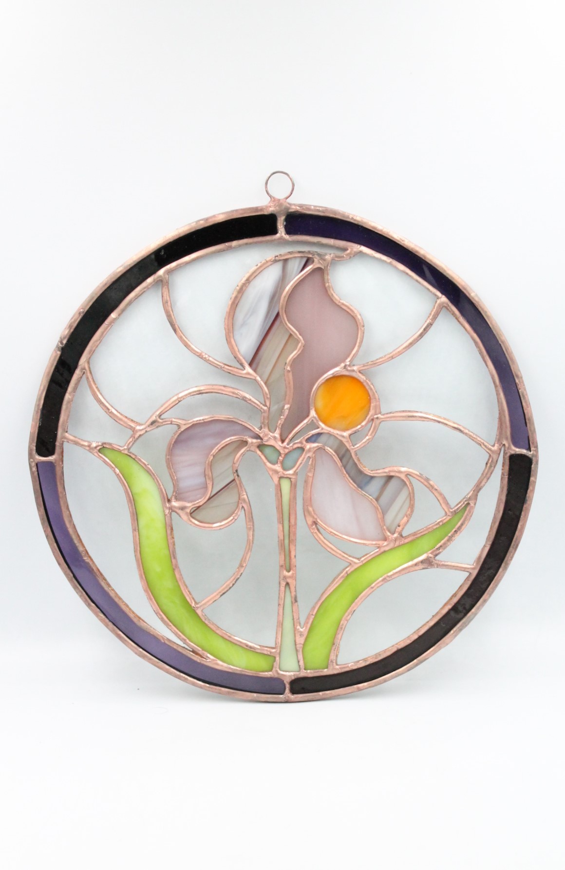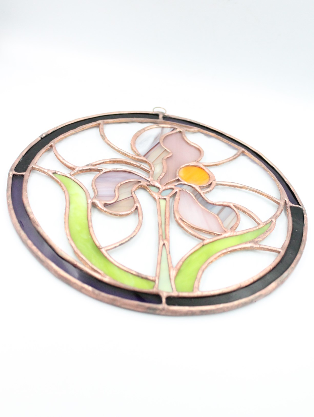 Ten witraż na ścianę w stylu secesji został wykonany ręcznie w technice Tiffany i przedstawia stylizowany motyw roślinny o płynnych, organicznych liniach. Kompozycja zamknięta w okrągłej formie nawiązuje do estetyki epoki Art Nouveau – subtelnej, dekoracyjnej i pełnej światła.